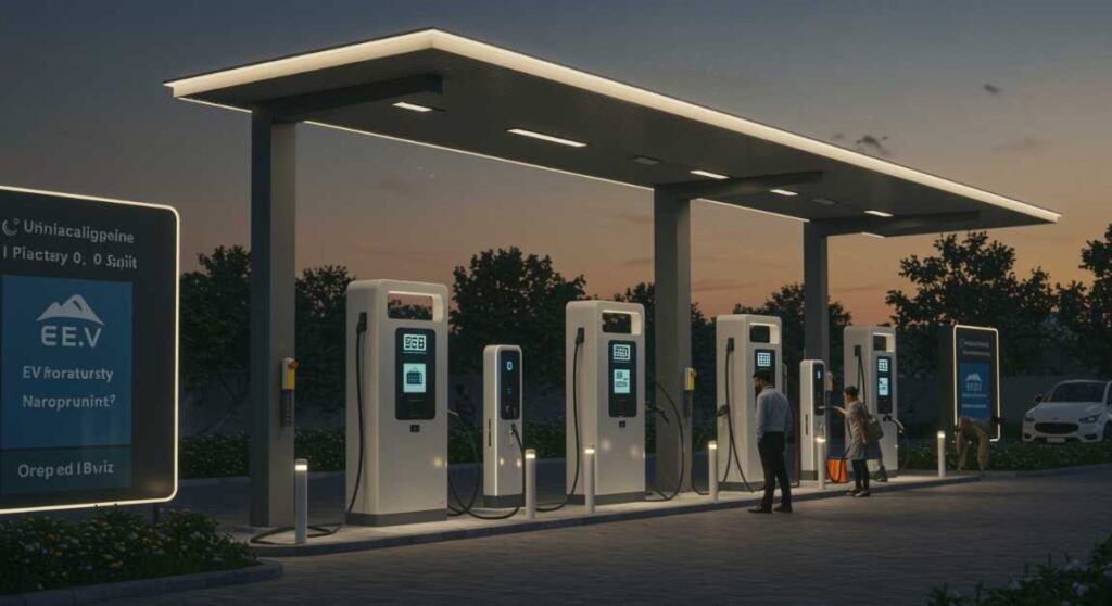 The typical outlay ranges from ₹1 crore to ₹2 crore. This figure includes civil works, fast and slow chargers, software integration, branding, and initial franchise fees.